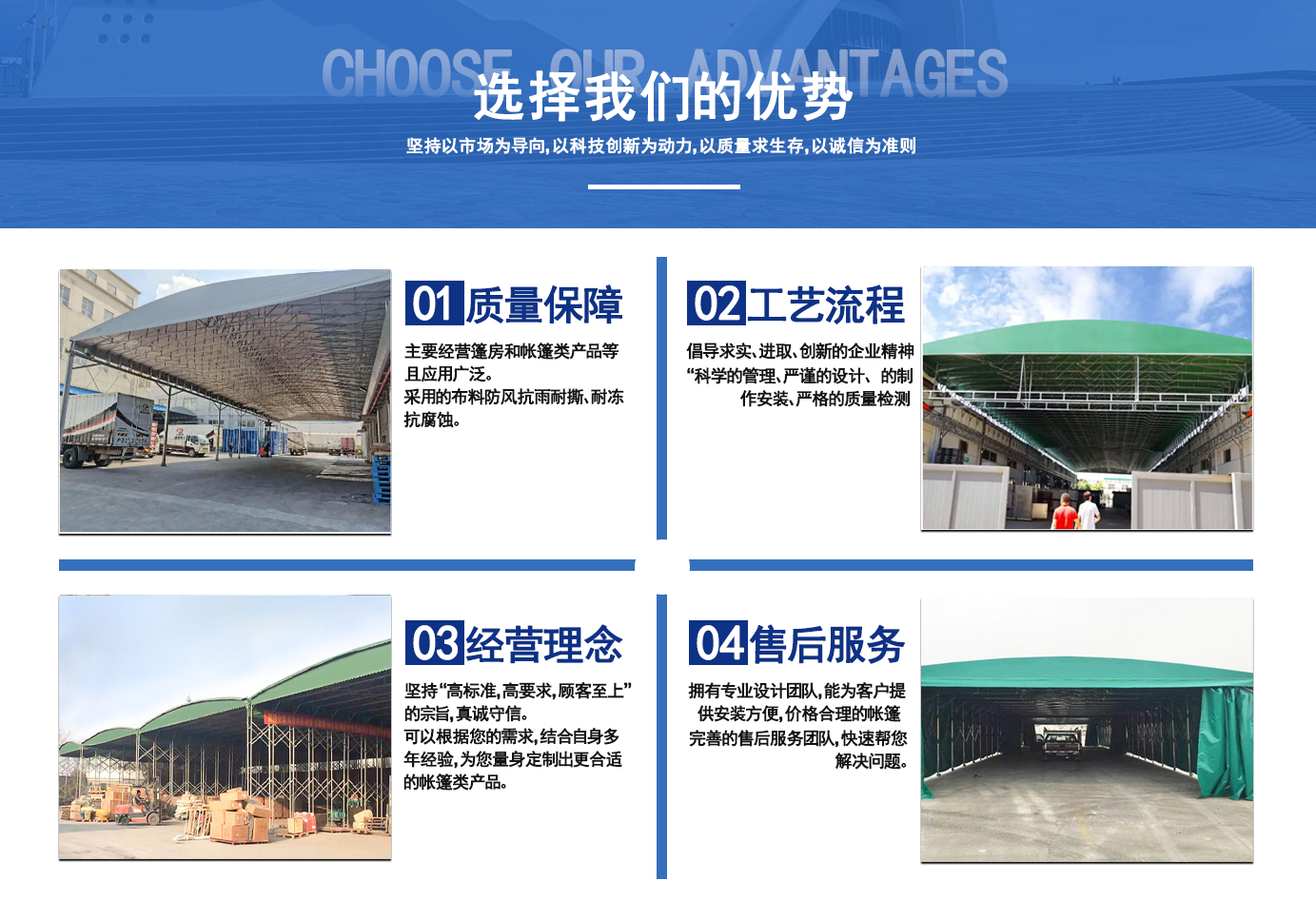 遼寧拓圖鋼結構工程有限公司是一家專業從事推拉篷設計、制作、安裝、使用、維修的綜合性公司。公司主營:電動雨棚、活動雨棚、倉庫雨棚、體育類雨棚、篷房、篷布、帳篷等系列產品的制作與安裝?! ?nbsp; 遼寧拓圖鋼結構工程有限公司堅持以市場為導向,以科技創新為動力,以質量求生存,以誠信為準則,倡導求實、進取、創新的企業精神?!翱茖W的管理、嚴謹的設計、 的制作安裝、嚴格的質量檢測、良好的后期服務成就企業的信譽,為您提供優質服務。 遼寧拓圖鋼結構工程有限公司傾力于開發應用三維空間結構與新材料的結合,將廣告藝術視覺表現形式與張力膜材科學的結合,推出多彩推拉蓬,依靠先進的科學技術,將推拉蓬建筑表現形式無限延伸,立志走在建筑科學的前沿,引導建筑時尚潮流,我們的目標是使推拉蓬建筑在中國發展壯大。 遼寧拓圖鋼結構工程有限公司憑著極強的事業熱情和豐富的專業經驗以“勤勉進取、銳意創新、至誠至信”的精神使公司得到迅速健康發展,業務范圍遍及全國??茖W的管理、嚴謹的設計、高標準的制作安裝流程,嚴格把控產品質量,熱誠的售后服務是企業競爭力的源泉?! ?nbsp; 遼寧拓圖鋼結構工程有限公司人愿以最誠摯的態度,歡迎廣大客戶的蒞臨與溝通!愿為市場提供優...